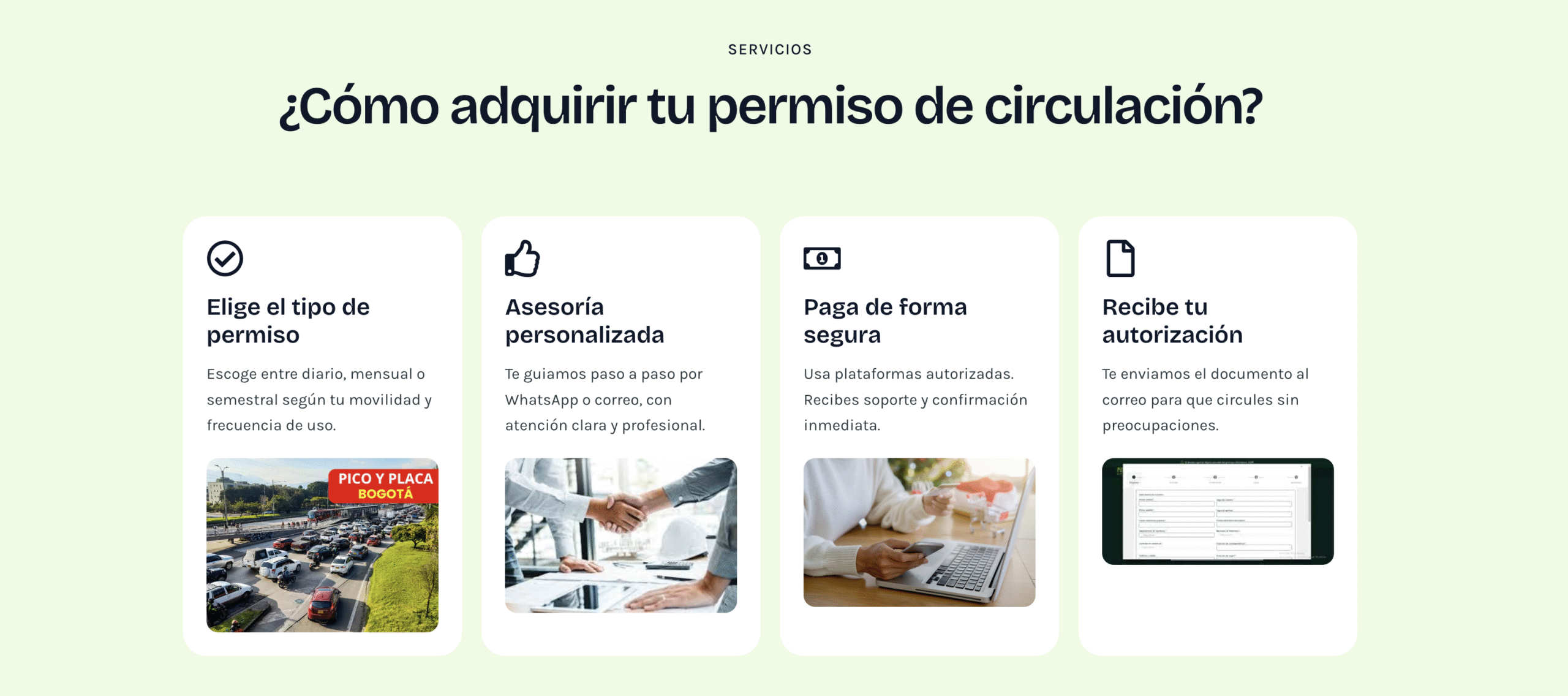 Inicio Circula sin restricciones en Bogotá Realiza tu solicitud de circulación con ayuda profesional. Te guiamos en un proceso digital, sin filas ni trámites presenciales. Duración de permiso * Diario Mensual Semestral Tipo de cilindraje * Menor a 1,500 cc 1,500 cc a 3,000 cc Mayor a 3,000 cc Tipo de combustible * Gasolina Gas natural vehicular (GNV) Diésel Gas gasolina Etanol Biodiésel Gas licuado del petróleo (GLP) Modelo Antes de 1998 1998 - 2009 2010 - 2014 2015 en adelante Avalúo * Hasta $ 55.679.000 Desde $ 55.679.001 hasta $ 125.274.000 Mayor a $ 125.274.001 Municipio de matricula * Bogota, D.C Otros municipios Cotizar Solicitar Asesoria Registrar Vehiculo Pago por Día Circula cuando lo necesites. IIdeal para días puntuales. Evita sanciones y cumple la norma. Pago Mensual Muévete todo el mes. Para quienes requieren circular de forma frecuente. Pago Semestral Ahorra tiempo y dinero. Una sola gestión y olvídate de renovaciones por 6 meses. Sobre pico y placa¿Qué es el Pico y Placa en Bogotá?Es una medida que regula el tránsito vehicular por días y placas.Puedes gestionar un permiso autorizado para circular legalmente Conduce sin preocuparte por restriccionesEvita sanciones y bloqueos vialesTodo el trámite es digital y seguro Solicitar PERMISO ¡Circula sin restricciones hoy! ¡Circula sin restricciones hoy! Gestiona tu autorización digital en minutos con acompañamiento experto. Iniciar Inscripción Te acompañamos en todo el proceso¿Por qué gestionar tu permiso con nosotros? Asesoría personalizadaTe explicamos todo en lenguaje simple. No estás solo en el proceso. Rápido y digitalTe entregamos un permiso auténtico para circular sin sanciones. AcompañamientoObtienes una autorización oficial para evitar multas y circular con tranquilidad.